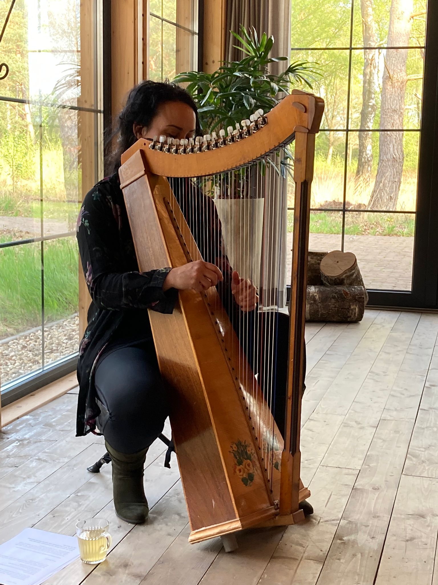 Op de achtergrond klonk zacht de harp van Femke Bloem. Zij verzorgde de beide avonden de achtergrond muziek. Harpmuziek, gespeeld vanuit het hart, betovert, verbindt, geneest, neemt je mee en bespeelt je…aldus Femke.