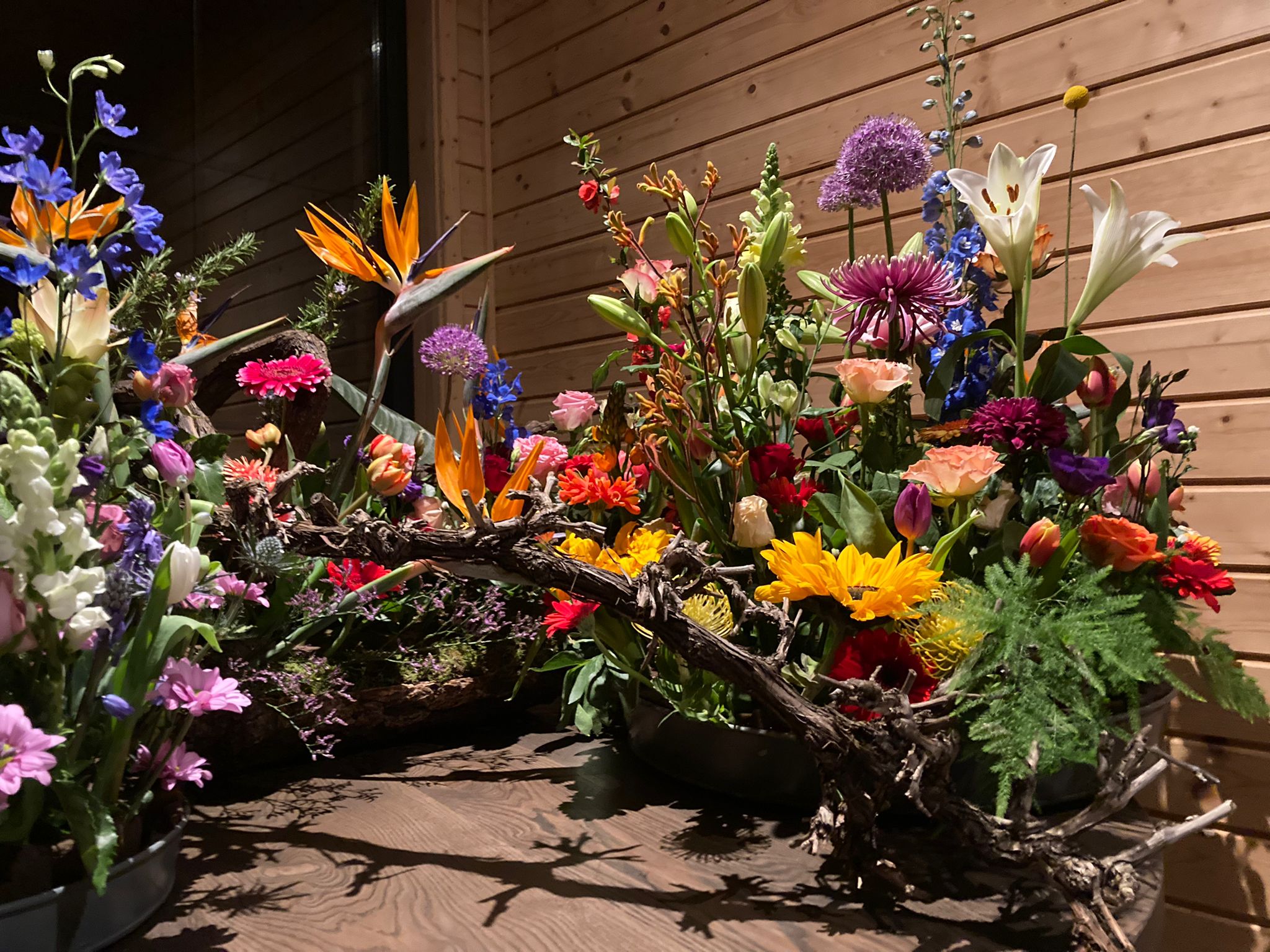 Beide avonden begonnen met het in ontvangst nemen van de meegebrachte bloemen. Onze bloemist bundelde deze in een gezamenlijk gedenkstuk. Wat begon met een paar losse takken op de eerste avond, eindigde na de tweede avond met een prachtig gedenkstuk. Een bloemenpracht die symbool staat voor de verbondenheid met elkaar.