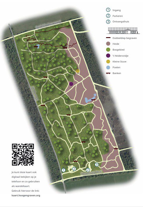 Op onderstaande plattegrond kun je de paden en bankjes goed vinden. Als je de natuurbegraafplaats wil bezoeken, kun je een papieren plattegrond ophalen in het ontvangsthuis. Je kunt de plattegrond ook raadplegen via jouw mobiele telefoon. Ga dan naar de link kaart.hoogengraven.org. We zijn 7 dagen per week geopend tussen 09:00 en 17:00 uur.